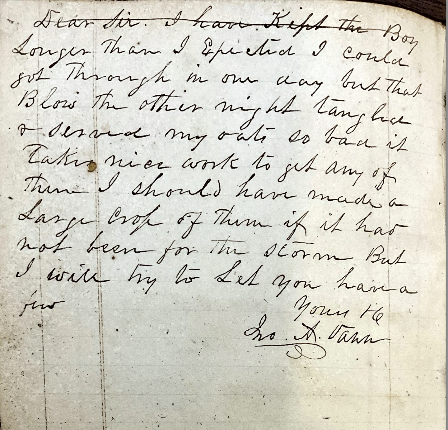 - A note describing how oat cultivation was damaged by a storm. Likely addressed to another enslaver because it refers to ‘a boy’ that Vann is keeping a bit longer because of the storm. I would date to the 1850s.