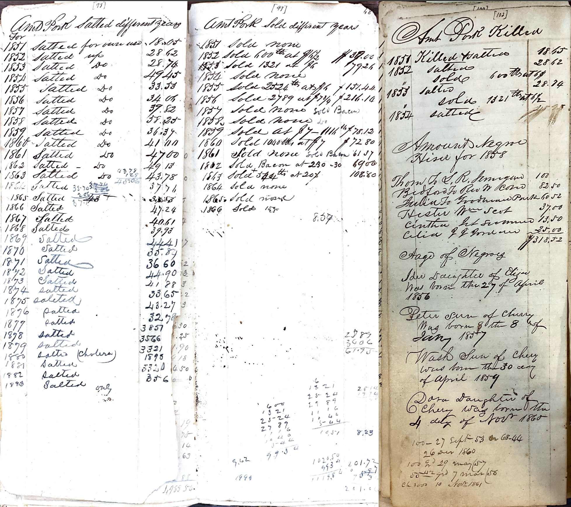 - A detailed account of hog production and consumption on the Vann plantation from the 1850s to the 1880s, tracking pounds of pork killed, sold, salted, and kept—offering a vivid picture of how livestock shaped both business and daily life.