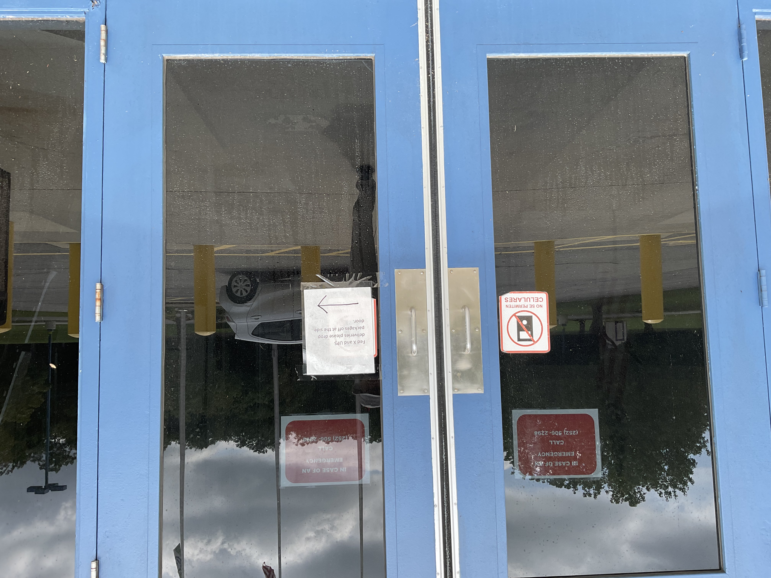- Signs posted on the front entrance to RCI that direct FedEx and UPS deliveries to the side door, prohibit cell phone use, and provide a number to call in case of emergency.